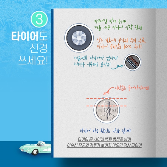 타이어 역시 겨울철에 매우 중요합니다. 눈이나 얼음이 있는 도로에서의 안전한 주행을 위해서는 겨울용 타이어를 장착하는 것이 필수적입니다. 겨울용 타이어의 트레드 깊이가 충분한지 확인하는 방법으로는 동전 테스트가 있습니다. 트레드 깊이가 4mm 이하라면 타이어를 교체해야합니다.