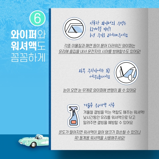 이처럼 겨울철 자동차 관리는 안전 운전을 위한 필수적인 과정입니다. 미리 점검하고 준비하여 안전하고 즐거운 겨울을 보내시기 바랍니다.