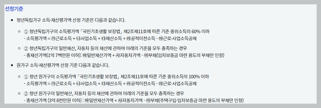 청년 본인 가구의 기준 중위소득 60% 이하로 1인 가구 기준 약 124만 원에 해당된다. 부모를 포함한 원 가구는 기준 중위소득 100% 이하로 3인 가구 기준 443만 원이다.